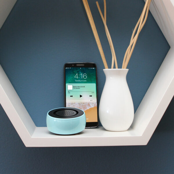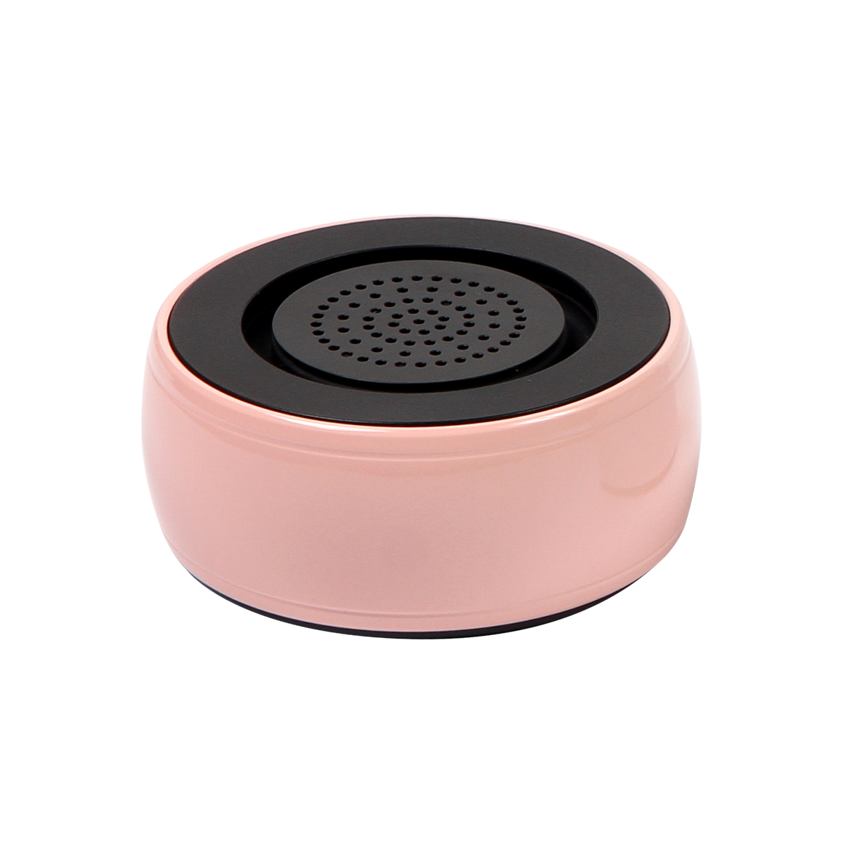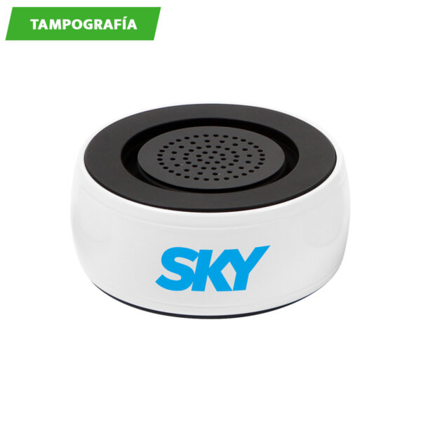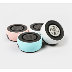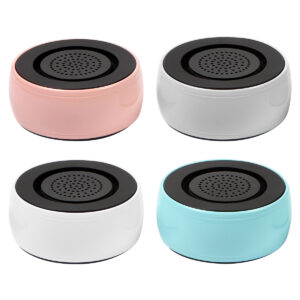 Bocina portátil circular bluetooth fabricada en metal y plástico, con radio FM, entrada auxiliar para audio y tarjeta TF.