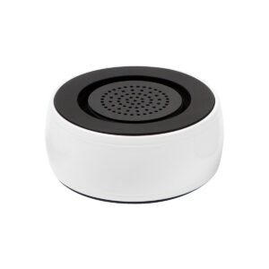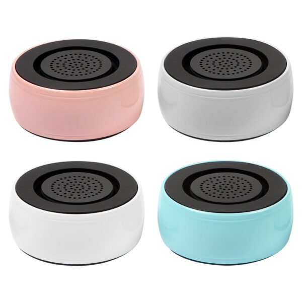 Bocina con conexión de sonido sin cables, portátil circular fabricada en metal y plástico, de tamaño compacto lo que la hace fácil de transportar, con radio FM, entrada auxiliar para audio y tarjeta TF.
