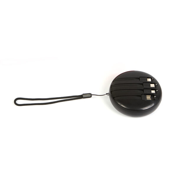 Power bank con diseño circular, fabricada en plástico ABS, un material duradero y resistente, incluye 4 cables de carga integrados, cuenta con correa para fácil transporte. El diseño circular no solo es estéticamente atractivo, sino que también aporta una ergonomía única. Capacidad de 10,000 mAh.